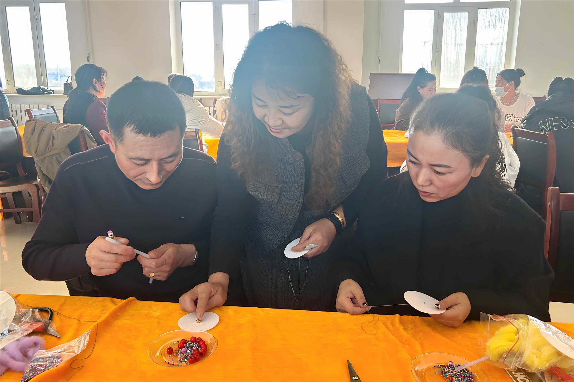 此次培训吸引了40名当地群众踊跃参与,课程将非遗文化传承与实用技能培训相结合,授课老师围绕太阳花制作的选珠、穿针、配色等关键环节进行细致讲解,并通过手把手教学、一对一指导的方式,帮助学员快速掌握实操技巧。参训学员相互交流经验、切磋技艺,现场学习氛围浓厚。大家纷纷表示,培训班恰逢农闲时节,实用性强、受益良多,不仅能学到一技之长,更为今后灵活就业、增加收入打下坚实基础。