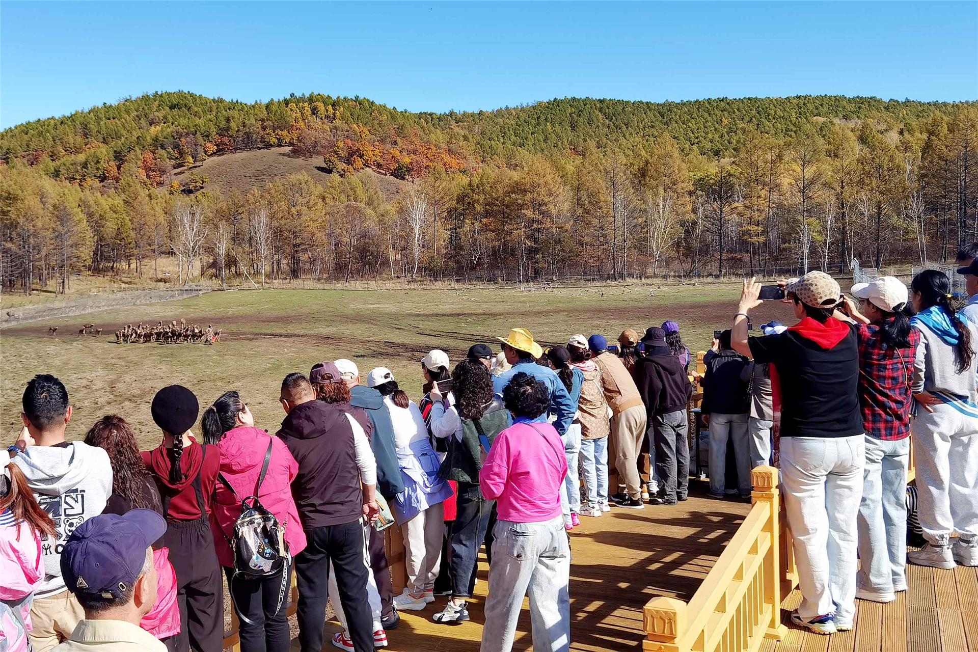 清晨的库伦沟林场,自驾车队的引擎声打破山林静谧,43辆贴有“阿荣旗金秋之旅”标识的车辆蜿蜒驶入,如一条长龙游弋在金色草原。游客们刚下车,便被鹿园的“小家伙”们围住,敲响铜锣,驯鹿踏着碎步从林间走来,温顺地蹭着游客掌心讨食,孩子们的笑声与鹿鸣声交织成“人与自然的协奏曲”。 沿着山间步道漫步,漫山遍野的秋景如画卷般展开,层林尽染的山峦与金黄璀璨的草原交相辉映,构成了一幅浓墨重彩的油画,红黄交织的树叶在微风中摇曳,引得游客纷纷驻足拍照,在光影中领略阿荣旗秋日山林的静谧与秀美。